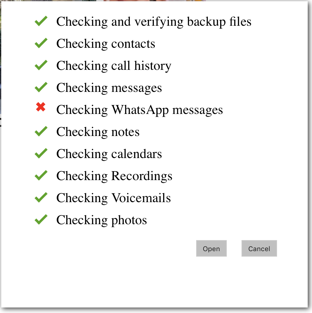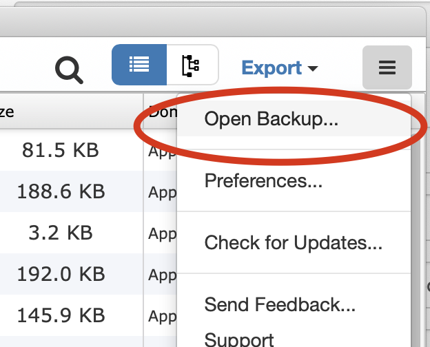 Ouvrir manuellement une sauvegarde enregistrée dans un emplacement différent de celui par défaut d’iTunes pour les sauvegardes. Si le dossier ouvert contient des fichiers de sauvegarde iOS mais manque le fichier d’informations méta nécessaire concernant la sauvegarde, iBackup Viewer tentera de réparer autant de données importantes que possible à partir de la sauvegarde. Si la sauvegarde est chiffrée avec un mot de passe, alors le fichier Manifest.plist est essentiel pour déverrouiller les données.