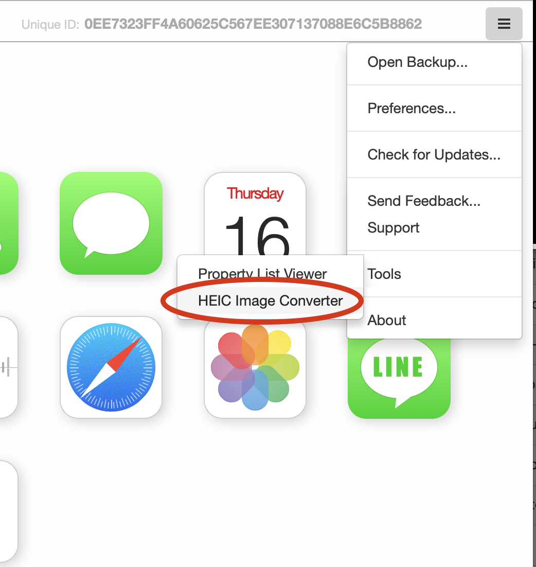 当 iBackup Viewer 启动后,从主菜单 -> 工具中选择“HEIC 图像转换器”